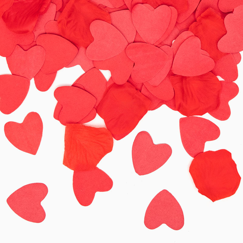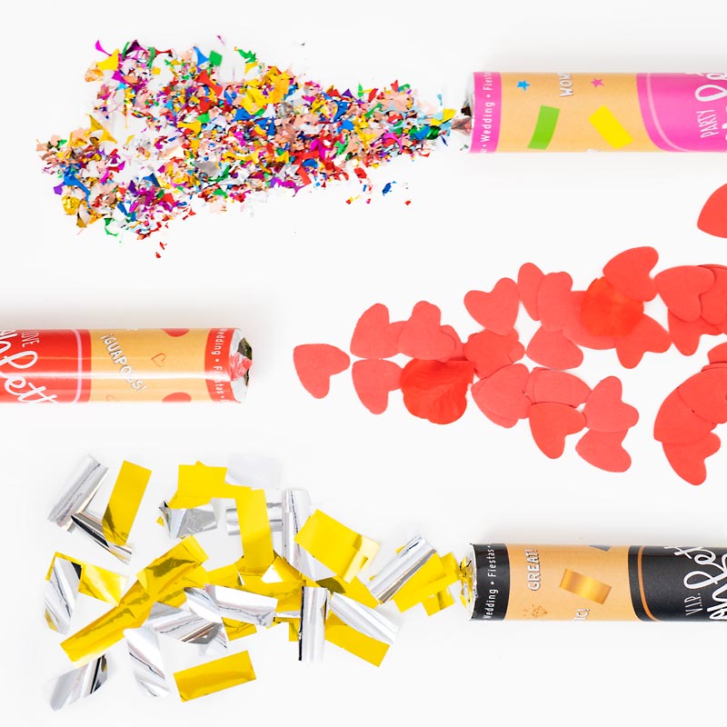 80 cm lange Konfettikanone mit Druckluft, die beim Drehen des Sockels Konfetti in Form von Stoffblütenblättern und Papierherzen abfeuert.❤️