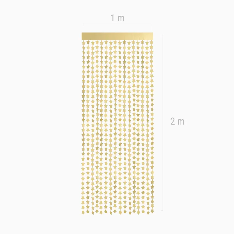 Goldfolienvorhang in Metallic-Optik, 2 m hoch und 1 m breit. Dekorieren Sie den Hintergrund Ihres Fototermins, um ihm durch den Glanz und die Bewegung der Fransen eine schickere Note zu verleihen. Ideal, um es mit verschiedenen Dekorationselementen zu füllen, die an Ihre Partys angepasst sind!