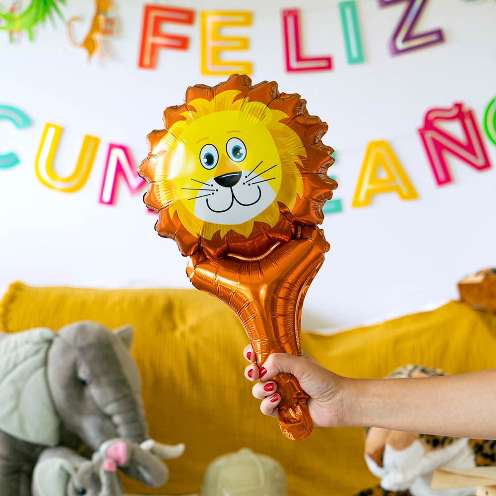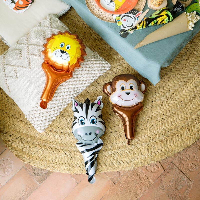 Set aus 4 handgehaltenen Folienballons in Form eines Affen, eines Löwen, einer Giraffe und eines Zebras.