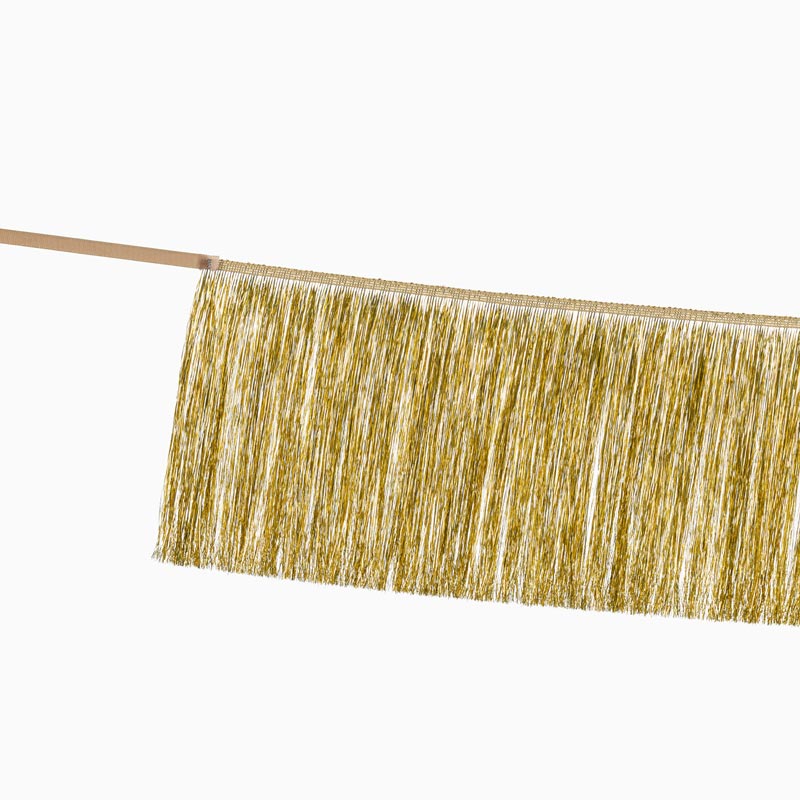 Elegante und raffinierte Fransengirlande aus Goldmetallicfolie, 20 cm hoch und 135 cm breit. Sie können es mit anderen Farben kombinieren und Paneele herstellen. Ideal für alle Arten von Feiern.