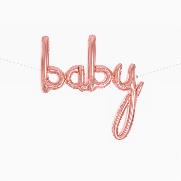 FOIL BALLS CALIGRAPHY LETTER 'BABY', 1 piece of 107 cm. Very easy to swell and hang. Ideal to complete Baby Showers parties, celebration of births or children's birthdays.