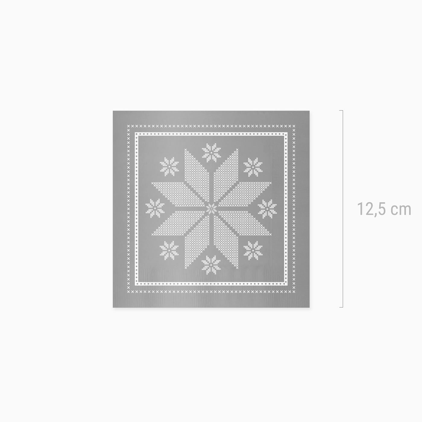 Pack of 30 silver metallic paper napkins, 25x25 cm, double layer and white embroidery.