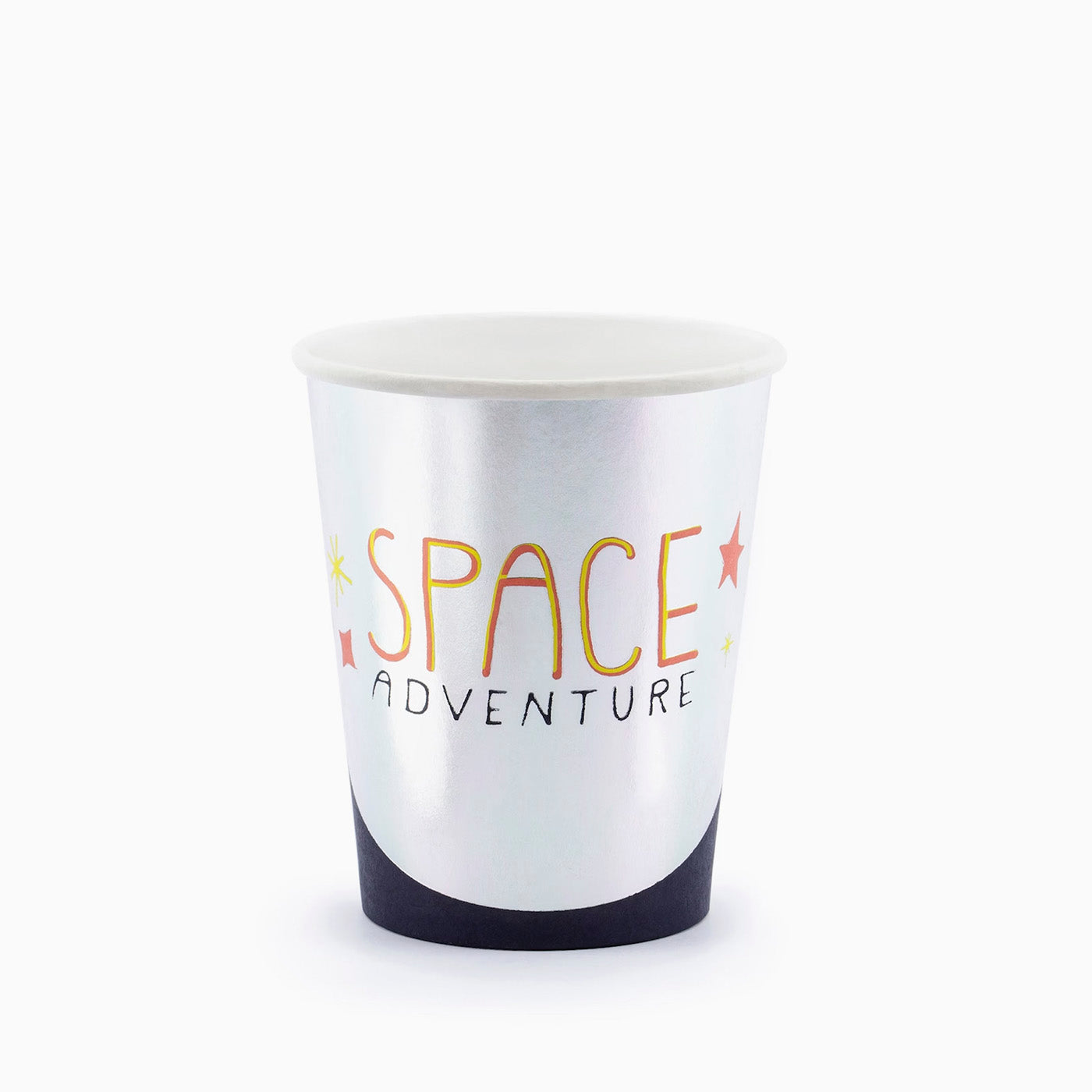 Silver cardboard cup with the message "Space Adventure" to celebrate the most fun theme parties or children's birthdays. Combine with the rest of the "Space adventure" elements to complete your parties!