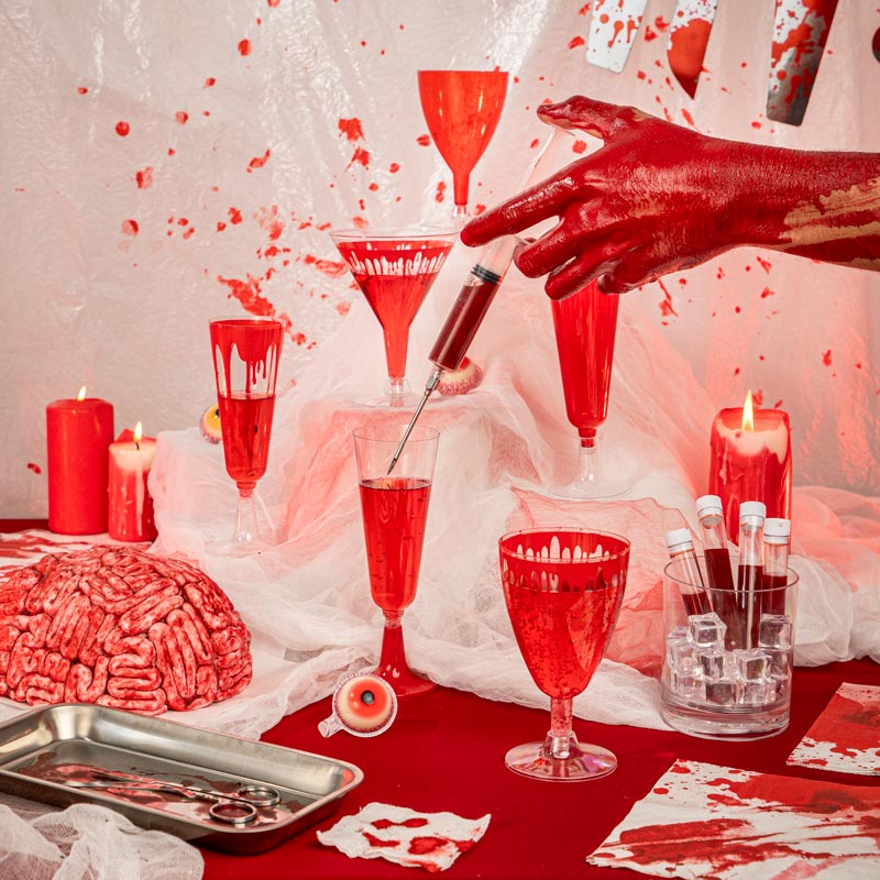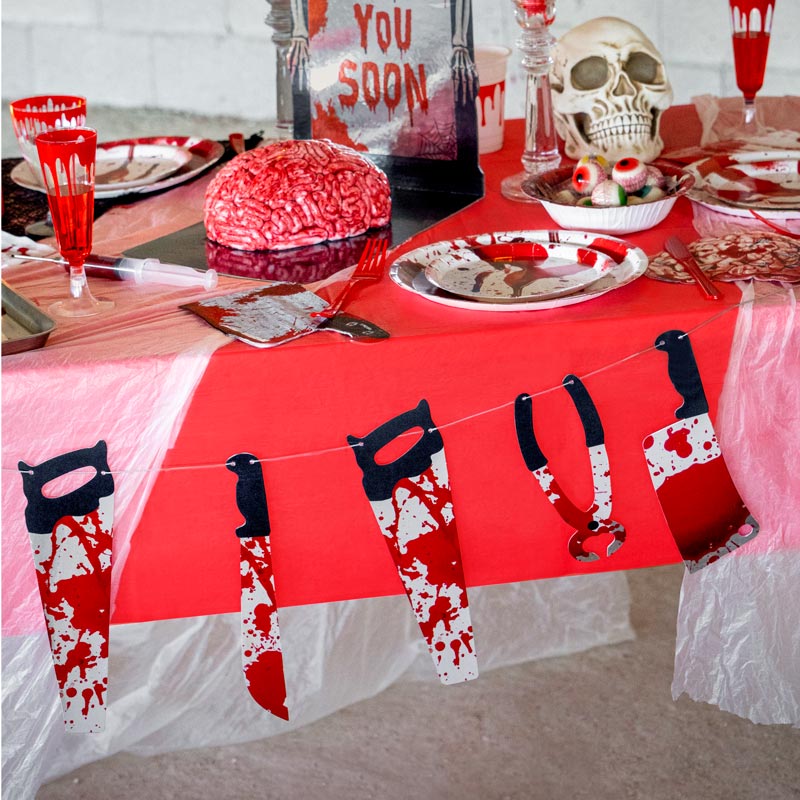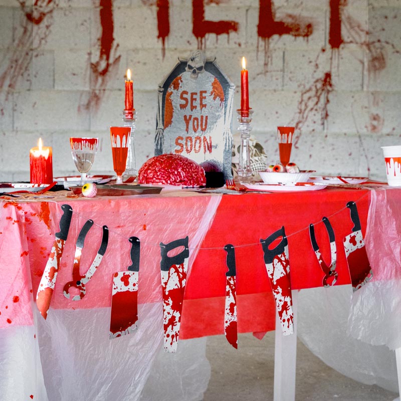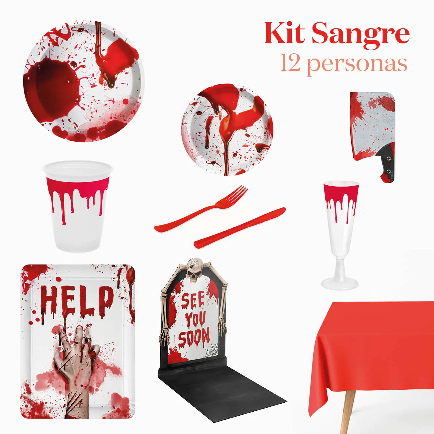 Kit Sang d'Halloween Premium pour 12 personnes, composé de : assiettes, nappe, verres, serviettes, plateaux et couverts. Ce kit contient un total de 105 pièces :