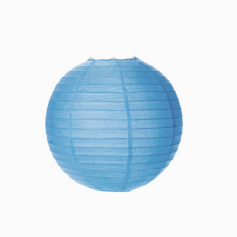 Pack de 1 lanterne ronde en papier bleu pastel. Produit 100% recyclable. Le produit est livré plié, prêt à être ouvert et assemblé avec la structure métallique.