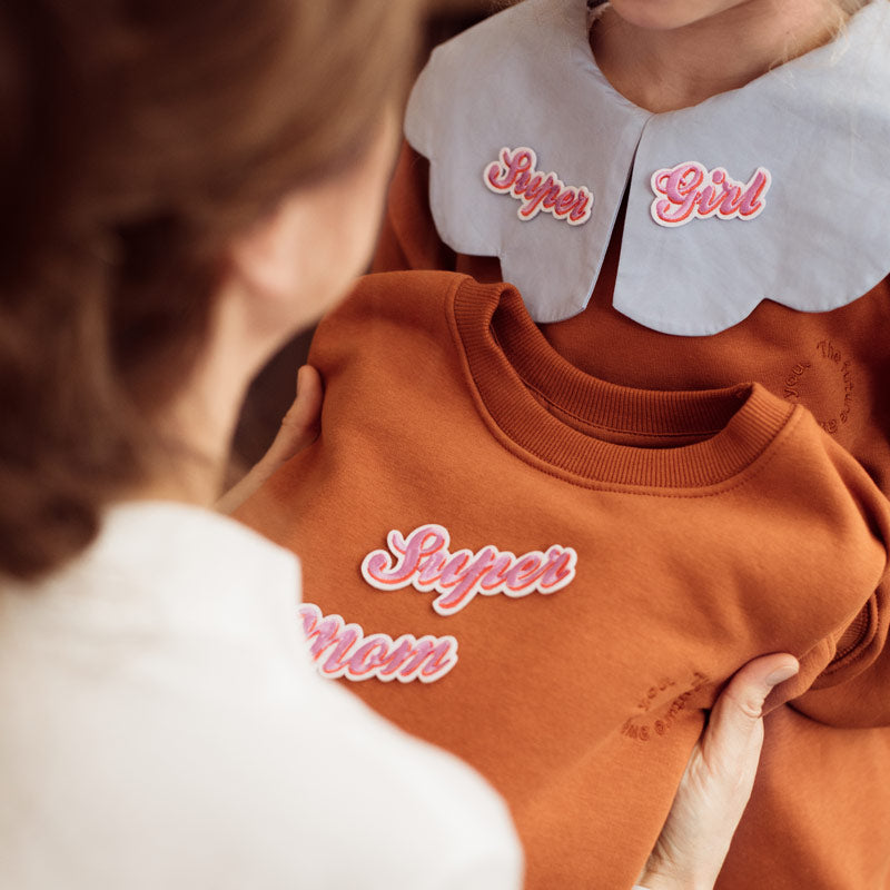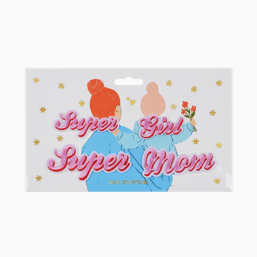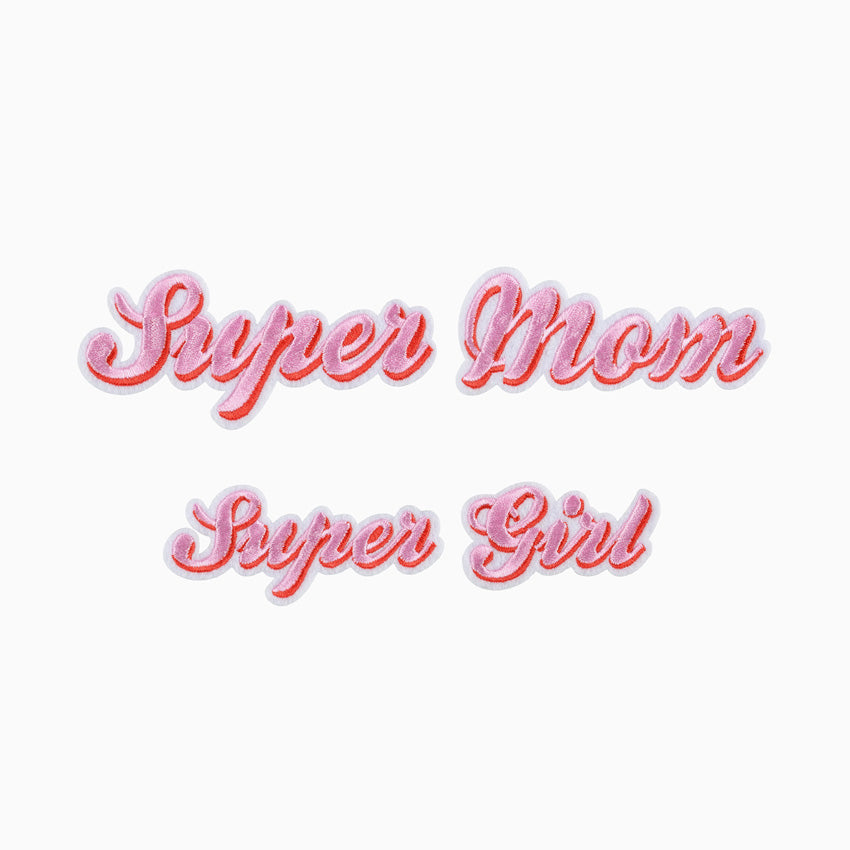 Thermadhesive Patch Super Mom, mélange de roses et blanc. Paquet de 2 unités avec des mesures de 14 x 3,5 - 19,5 x 5 cm.