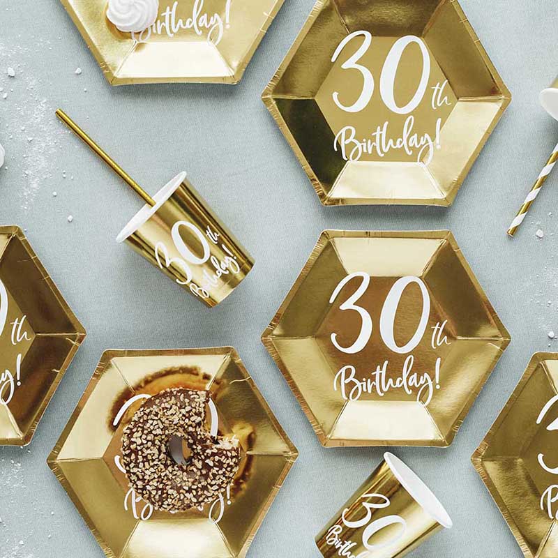 Des motifs liés à l'âge, comme le chiffre 30, des confettis, des ballons ou des messages de félicitations. Ils constituent une façon amusante d’ajouter une touche spéciale à la table et de souligner la célébration des 30 ans.