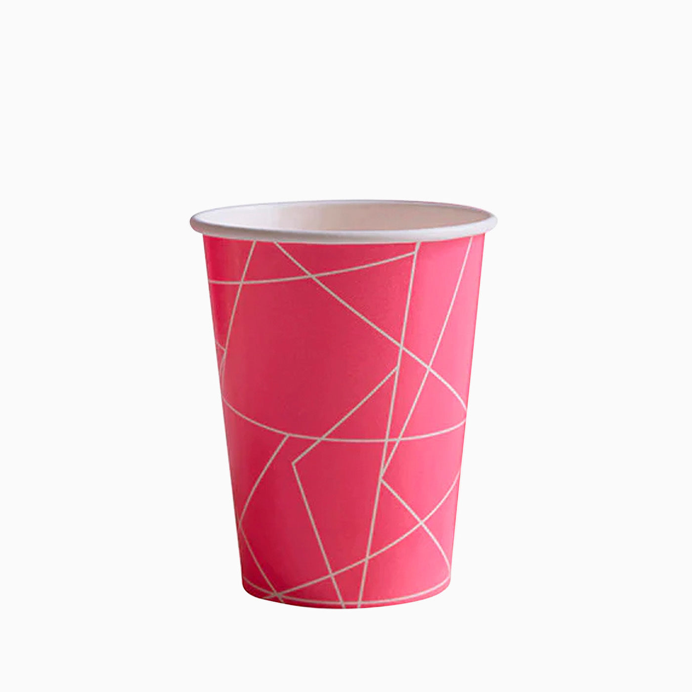 Tazza in cartoncino rosa con righe geometriche dorate ideale per i compleanni, i baby shower o le celebrazioni più colorate. Combinalo con il resto degli elementi neon per completare le tue feste!