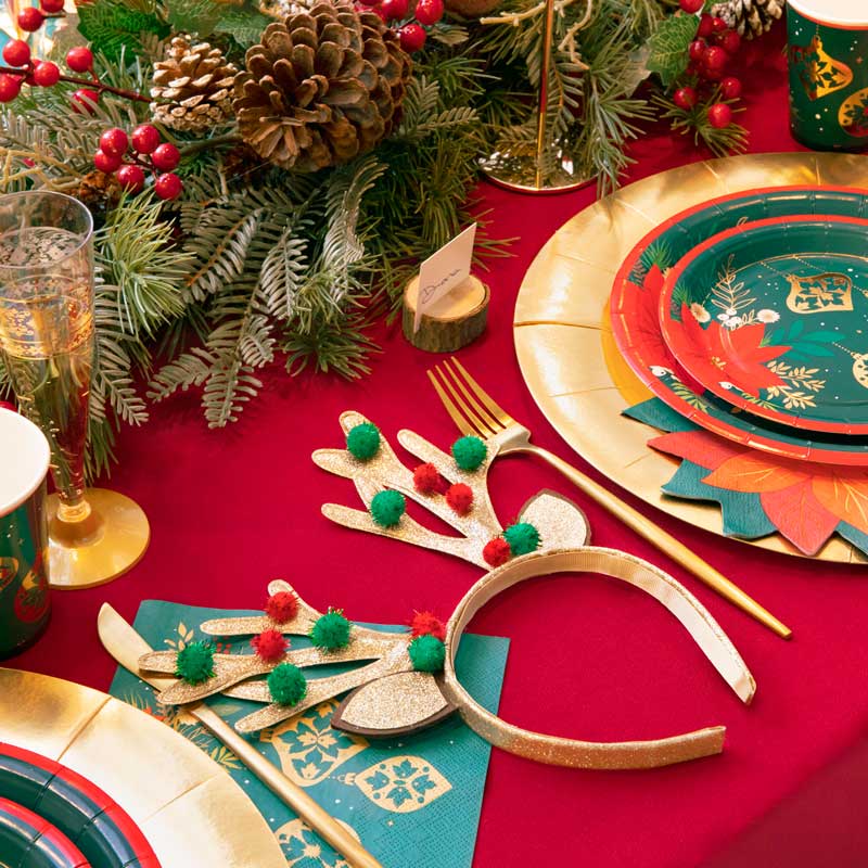 Diadema de Reno con pompones verde y rojos y cuernos en glitter oro. Genial para sorprender a tus invitados en las fiestas más navideñas. Combina con el resto de elementos de vajilla y decoración para completar tus fiestas!