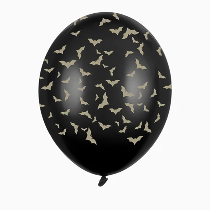 Pack de 6 globos látex de color negro con murciélagos en dorado, tamaño del globo Ø 30 cm. Combina con el resto de elementos de Halloween para completar tus fiestas!