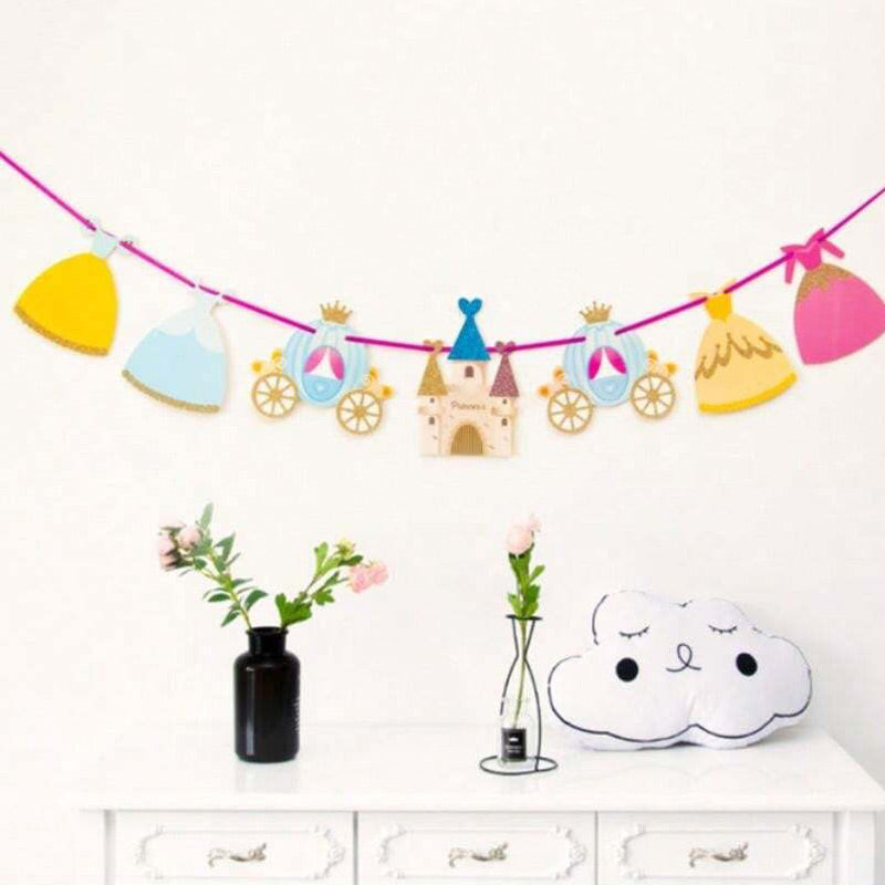 Guirnalda de cartón 2,5m de largo con detalles de temática de princesa. Contiene 7 piezas con un tamaño aproximado de 20 x 30,5 cm cada pieza.
