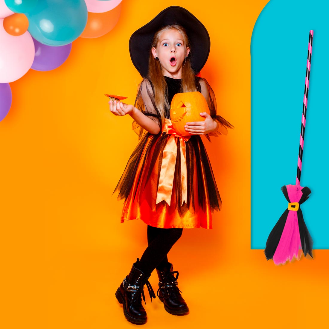 Vassoura de bruxa rosa de 90 cm com tema Halloween.