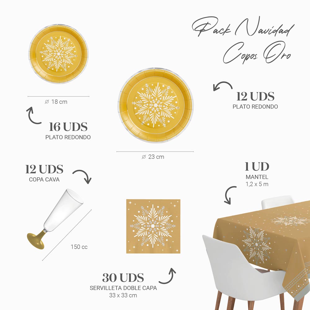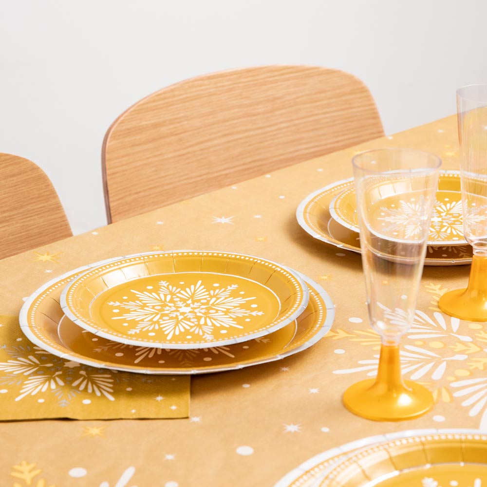 Plato Cartón Llano Navidad Ø 23 cm Copo de Nieve Oro y Blanco