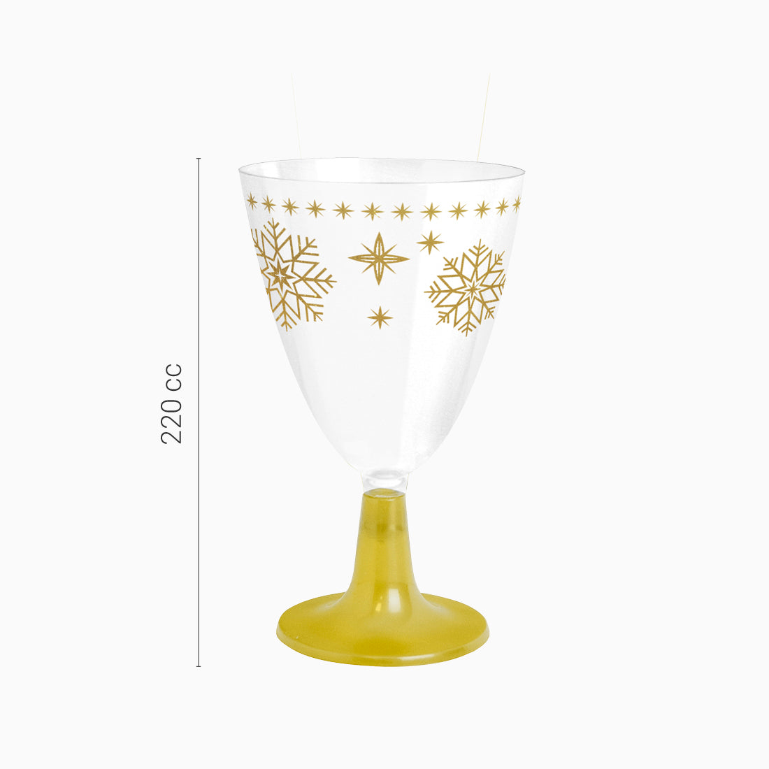 Packung mit 3 transparenten 220-cc-Wasser-/Weingläsern mit Metallic-Effekt und goldener Schneeflockenzeichnung.