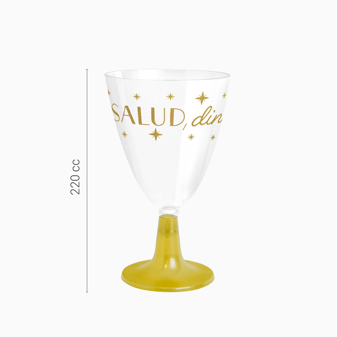 Packung mit 3 transparenten Wasser-/Weingläsern mit 220 cc, metallischem Effekt, goldener Schneeflockenzeichnung und der Botschaft „Gesundheit, Geld und Liebe“.