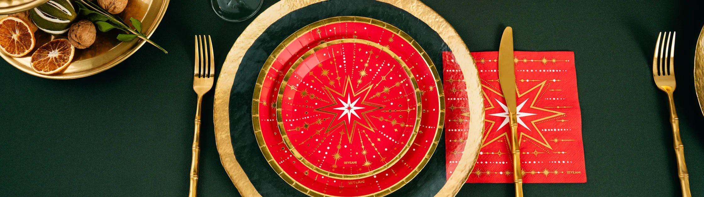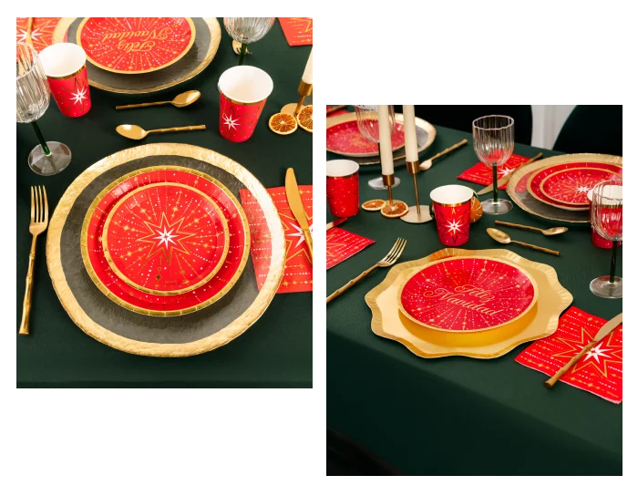 The large plates and the dessert plates from the Merry Christmas collection combine intense red with gold details and shiny stars that make your table look like something out of a magazine. Each piece adds an elegant and festive touch, turning even a simple appetizer into a special moment.
