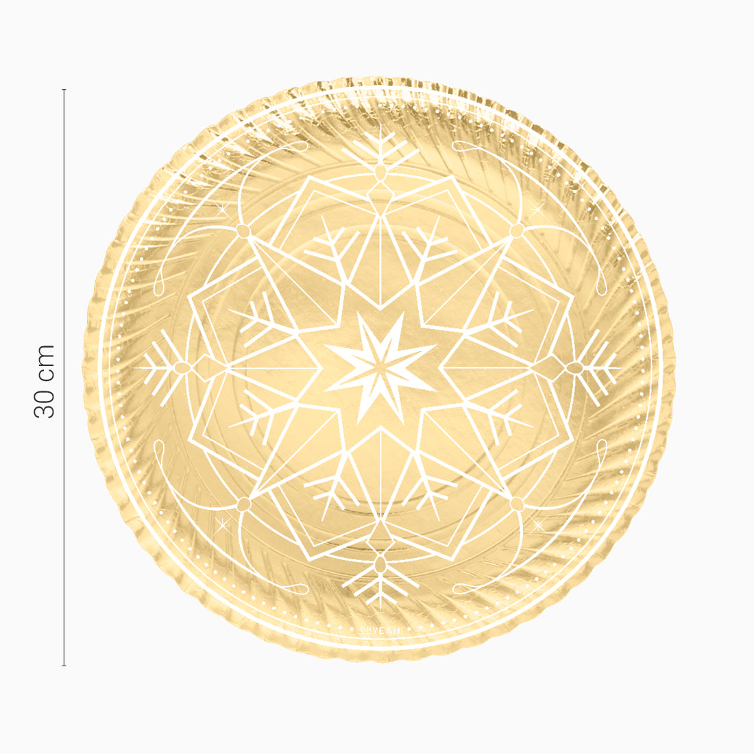 Pack of 2 round Christmas themed trays of Ø30 cm in gold color with a white snowflake design.