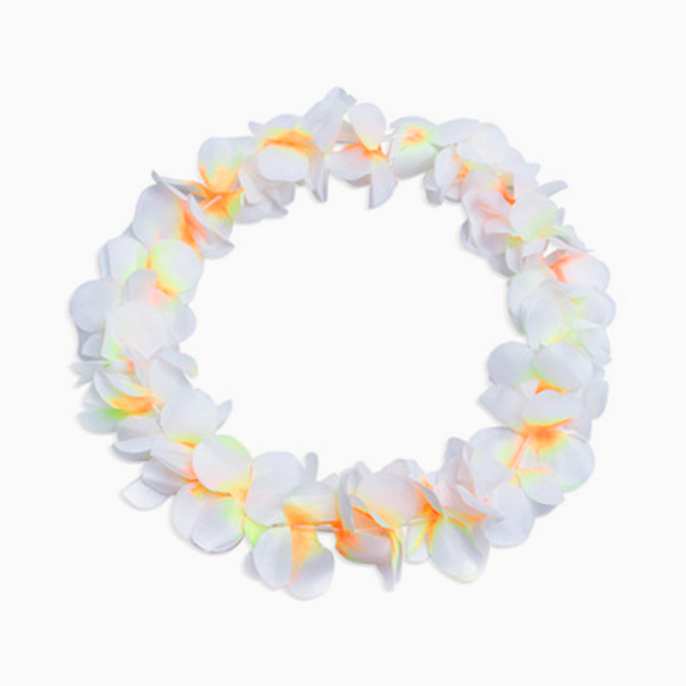 Colored flower necklace fastened by a white thread. Between flower and flower, it carries some plastic pieces so that the flowers are kept in place.