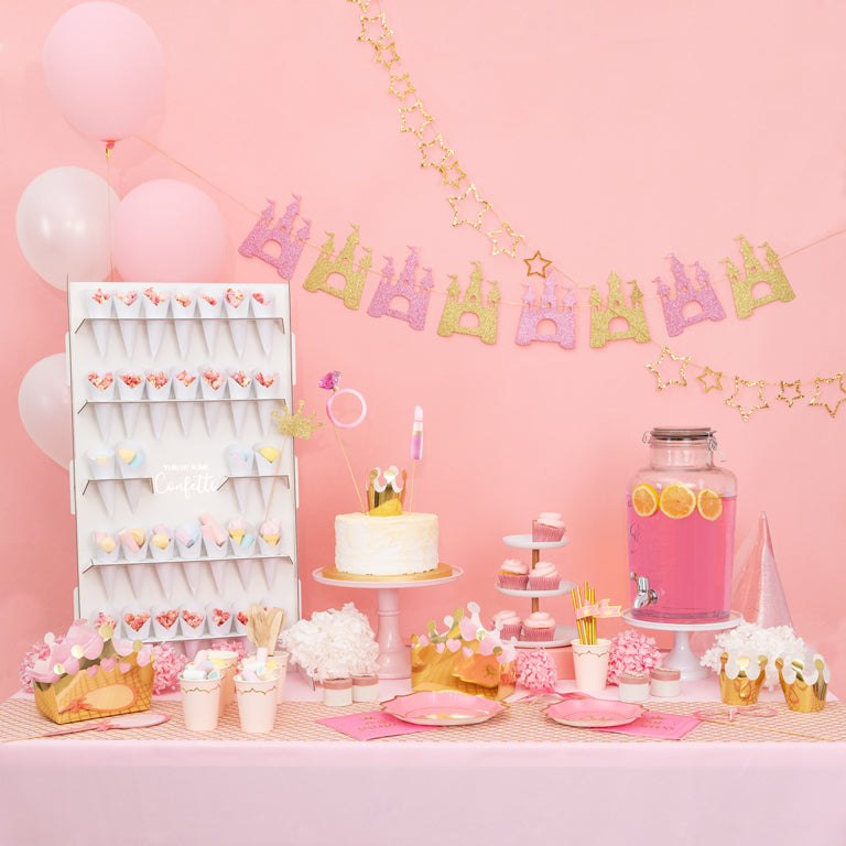 Cardboard Guirnalda 2.15 m long with princess castles in gold and pink glitter.