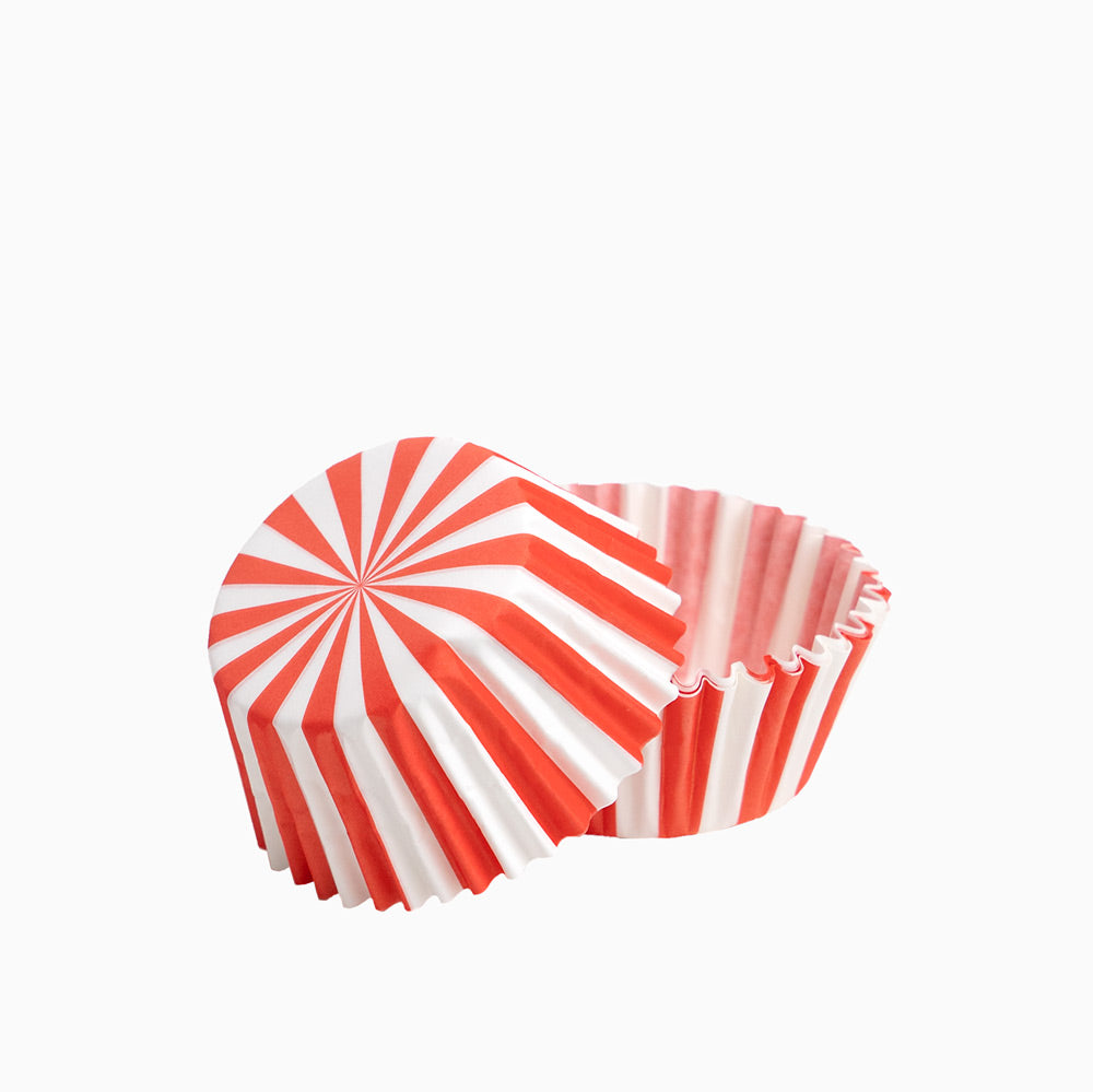 Pack of 50 small round molds of Ø 5.2 x 3 cm with red and white stripe design. Ideal for pastry, oven and microwave suitable.