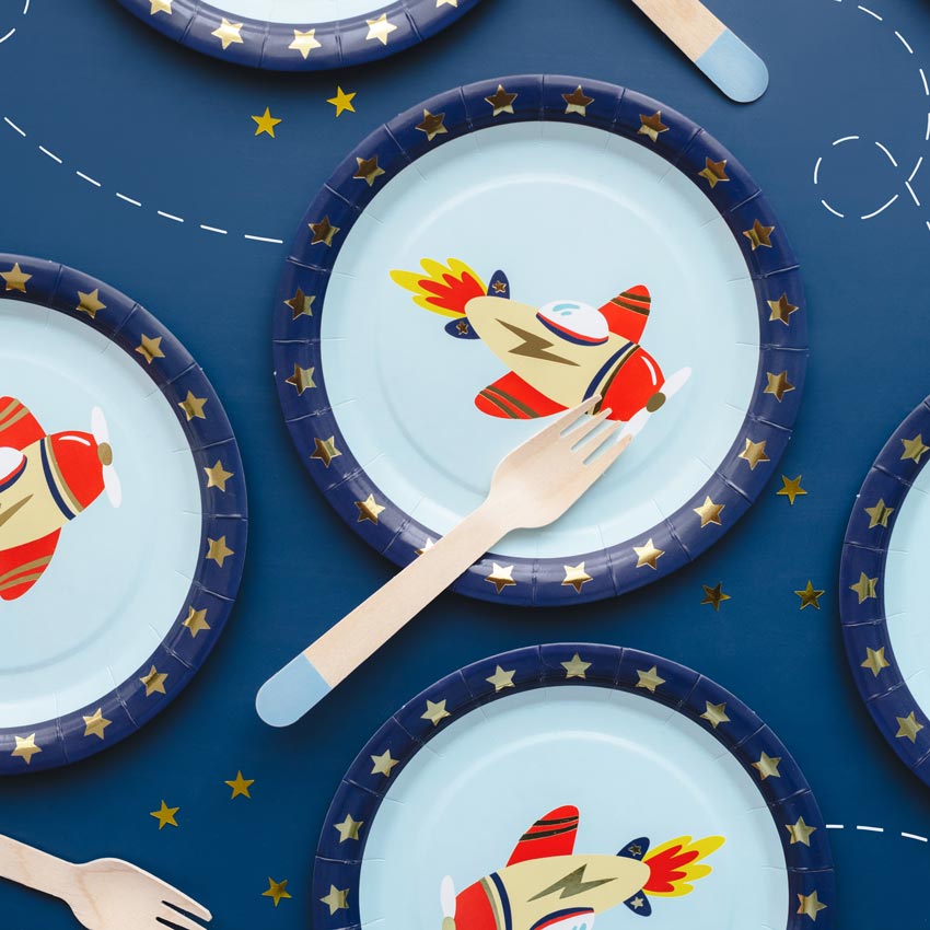 Pack of 6 paper plates with airplane drawing, Ø 18 cm.