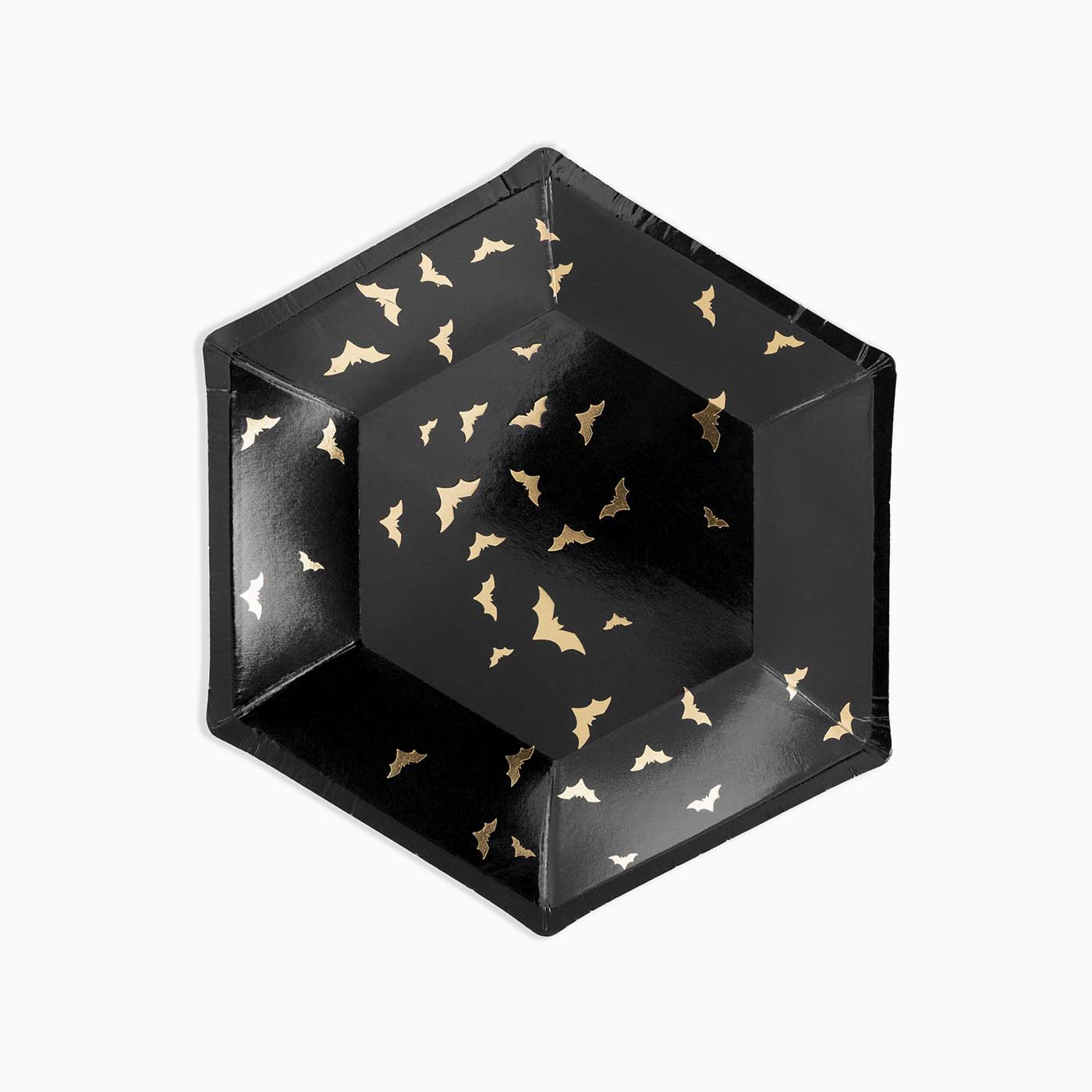 Pack of 6 black cardboard plates with gold bats for the most terrifying Halloween. Very fun to celebrate Halloween or the Day of the dead.