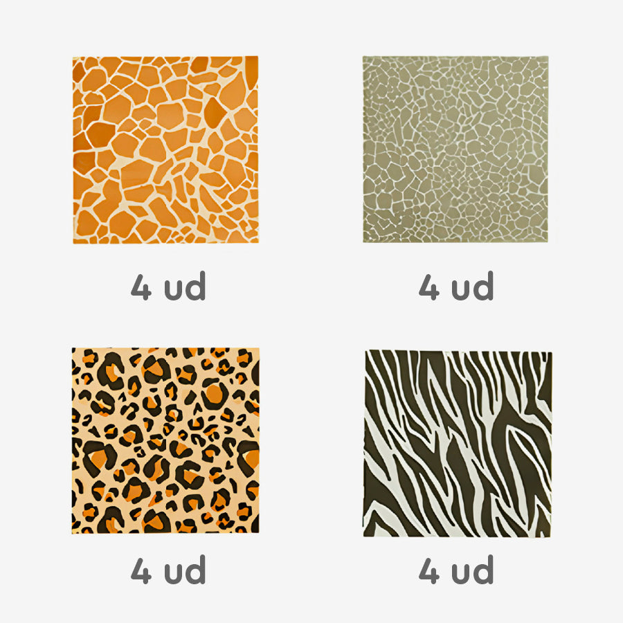 The pack contains 16 napkin units, 4 napkins of each animal print print.