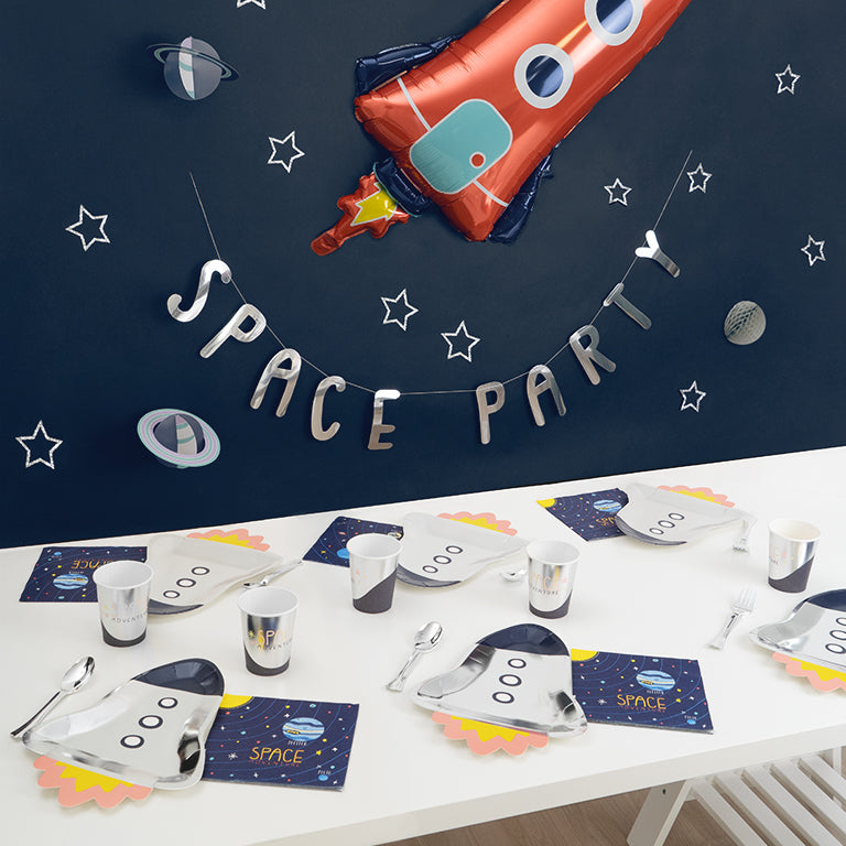 Silver cardboard cup with the message "Space Adventure" to celebrate the most fun theme parties or children's birthdays. Combine with the rest of the "Space adventure" elements to complete your parties!