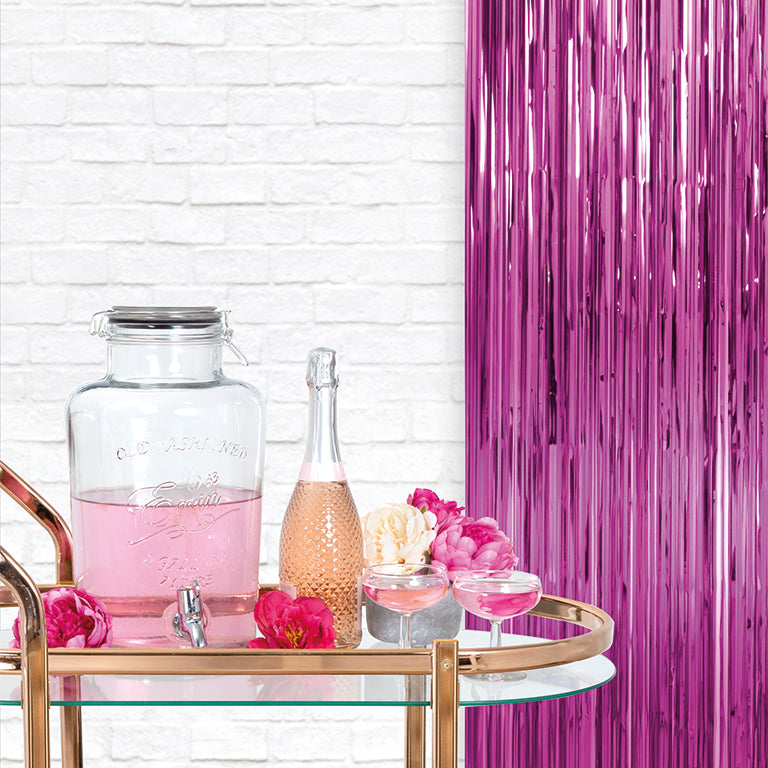 Rideau en feuille rose en finition métallique de 2,40 m de haut et 0,90 m de large. Décorez le fond de votre photocall pour lui donner une touche plus chic avec la luminosité et le mouvement de ses franges. Idéal pour le remplir avec différents éléments de décoration adaptés à vos fêtes!