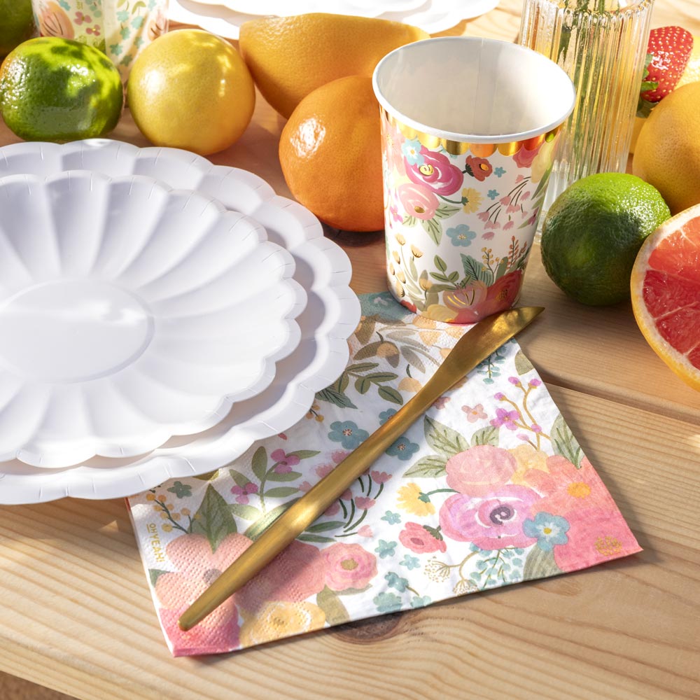 Ces gobelets en papier originaux de 270 cc ont un imprimé floral original de différentes couleurs, avec des détails dorés métallisés. Parfait pour tout type de célébration !