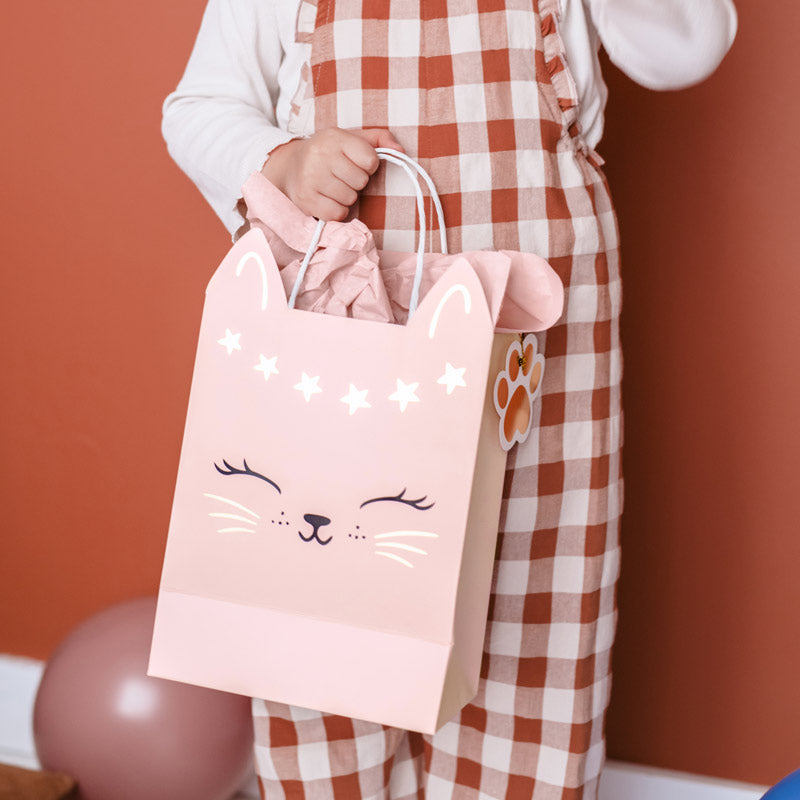 Scegli piatti, bicchieri, borse o inviti con gatti di gatti e dettagli di orecchie e baffi per una festa in stile felino.🍽️