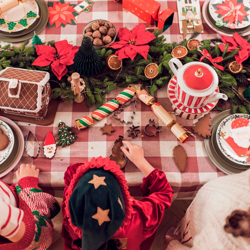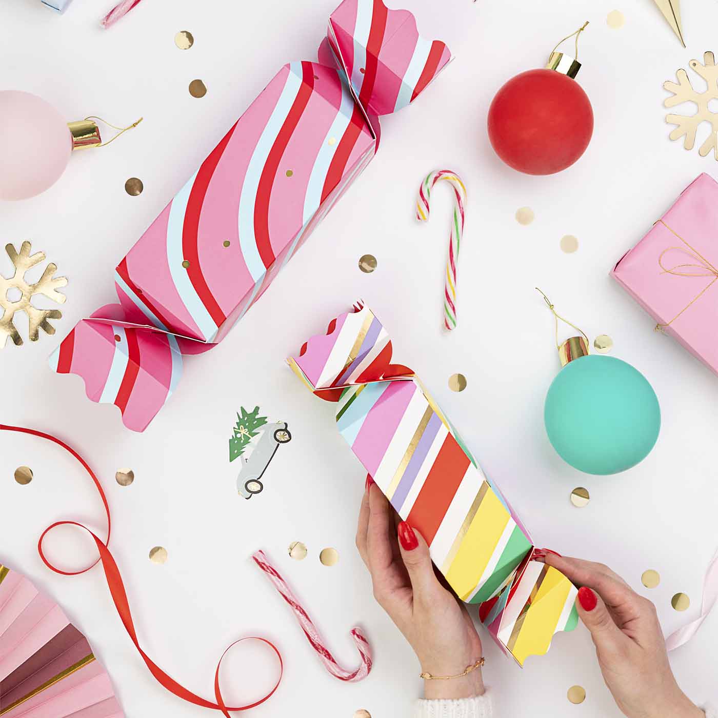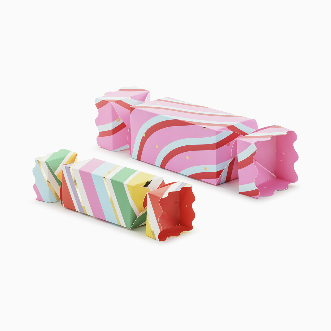 Piccole scatole regalo a forma di caramello realizzate in carta con miscela di colori e stampe di Natale.