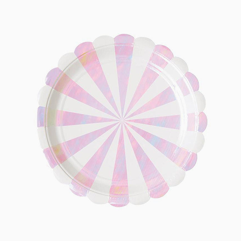 Piatto da dessert di cartone bianco e rosa iridescente Perfetto per i concorrenti o come un singolo piatto. Ideale per dare un tocco alle celebrazioni di compleanno per bambini speciali, alla festa di addio al nubilato, alle docce per bambini o alle feste a tema piene di magia. Combina con il resto degli elementi a strisce per completare le tue feste!