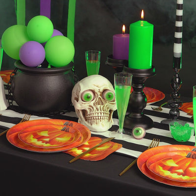 Ogni piatto, vetro e tovagliolo è decorato con vivaci colori arancione e nero, creando un'atmosfera festosa perfetta per le tue celebrazioni di Halloween. 🧙♀️🕸️