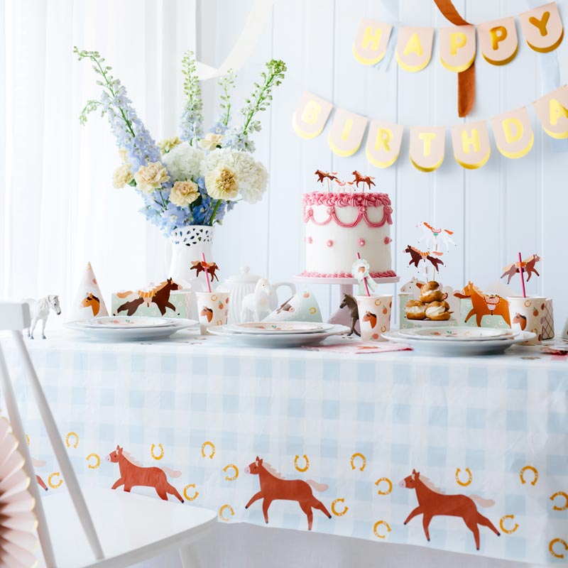 Trasforma il tuo spazio con bandiere e palloncini sotto forma di cavalli e cavalli. Usa tovaglie e tovaglioli con stampe equestri e centri di luogo con piccoli cavalli giocattolo e fiori selvatici 🌸.
