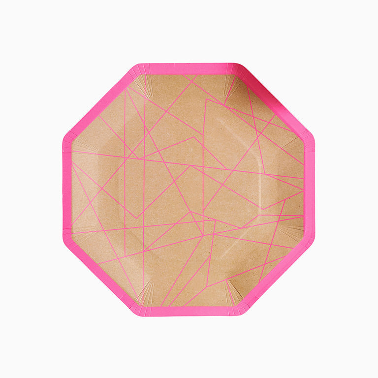 Tazza in cartoncino rosa con righe geometriche dorate ideale per i compleanni, i baby shower o le celebrazioni più colorate. Combinalo con il resto degli elementi neon per completare le tue feste!