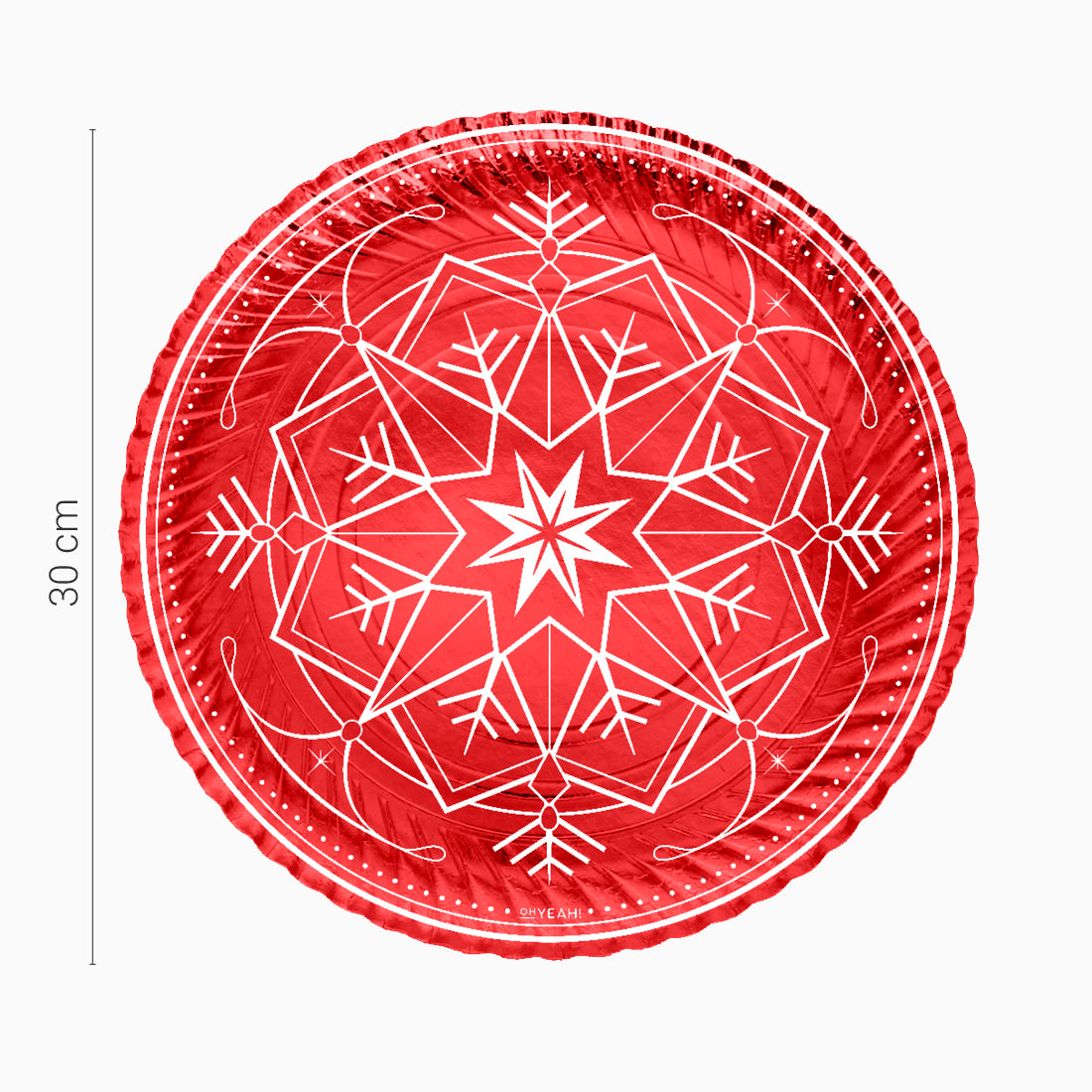 Pack de 2 bandejas redondas temática Navidad de Ø30 cm color rojo con diseño de copo de nieve en color blanco.