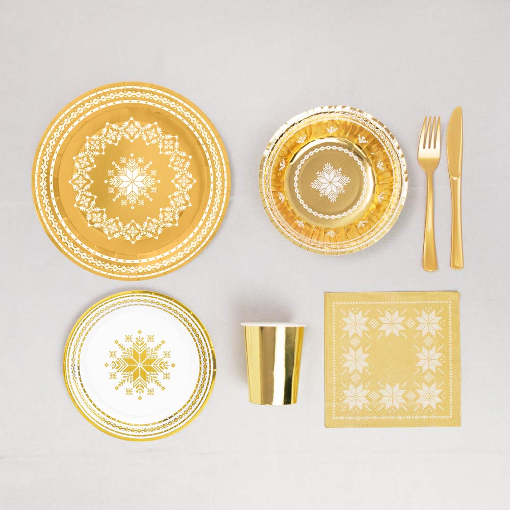Espectaculares bols en color oro con detalle de copo de nieve en color blanco. Además tienen un elegante y detallado borde en color blanco que los hacen todavía más espectaculares. Perfectos para cualquier reunión familiar o cena de Navidad.