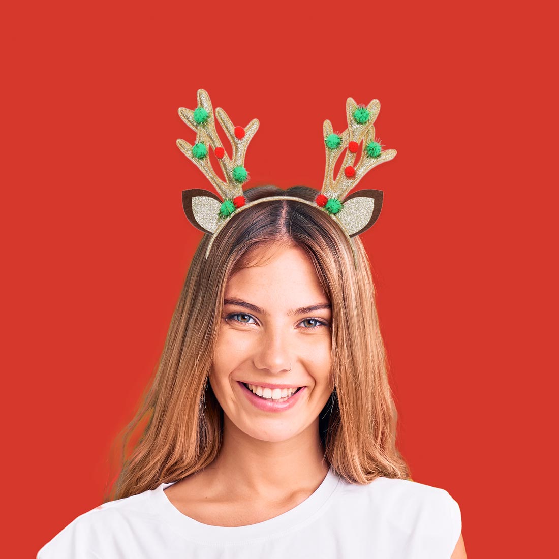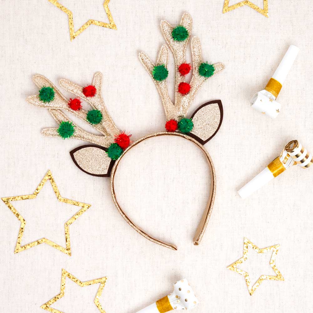 Diadema de Reno con pompones verde y rojos y cuernos en glitter oro. Genial para sorprender a tus invitados en las fiestas más navideñas. Combina con el resto de elementos de vajilla y decoración para completar tus fiestas!