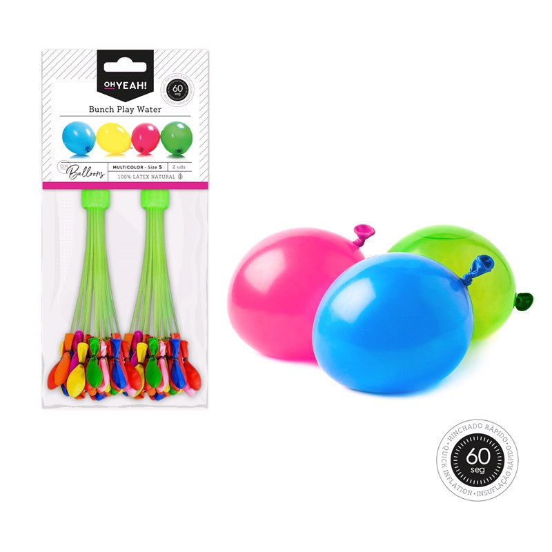 Pack de 2 dispensadores con 37 globos agua por dispensador, en colores flúor de 10 cm de látex de caucho natural. Ideales para llenar de agua y utilizar en fiestas de agua. Los globos van atados a las varillas de plástico para llenarlos de agua con mayor facilidad.