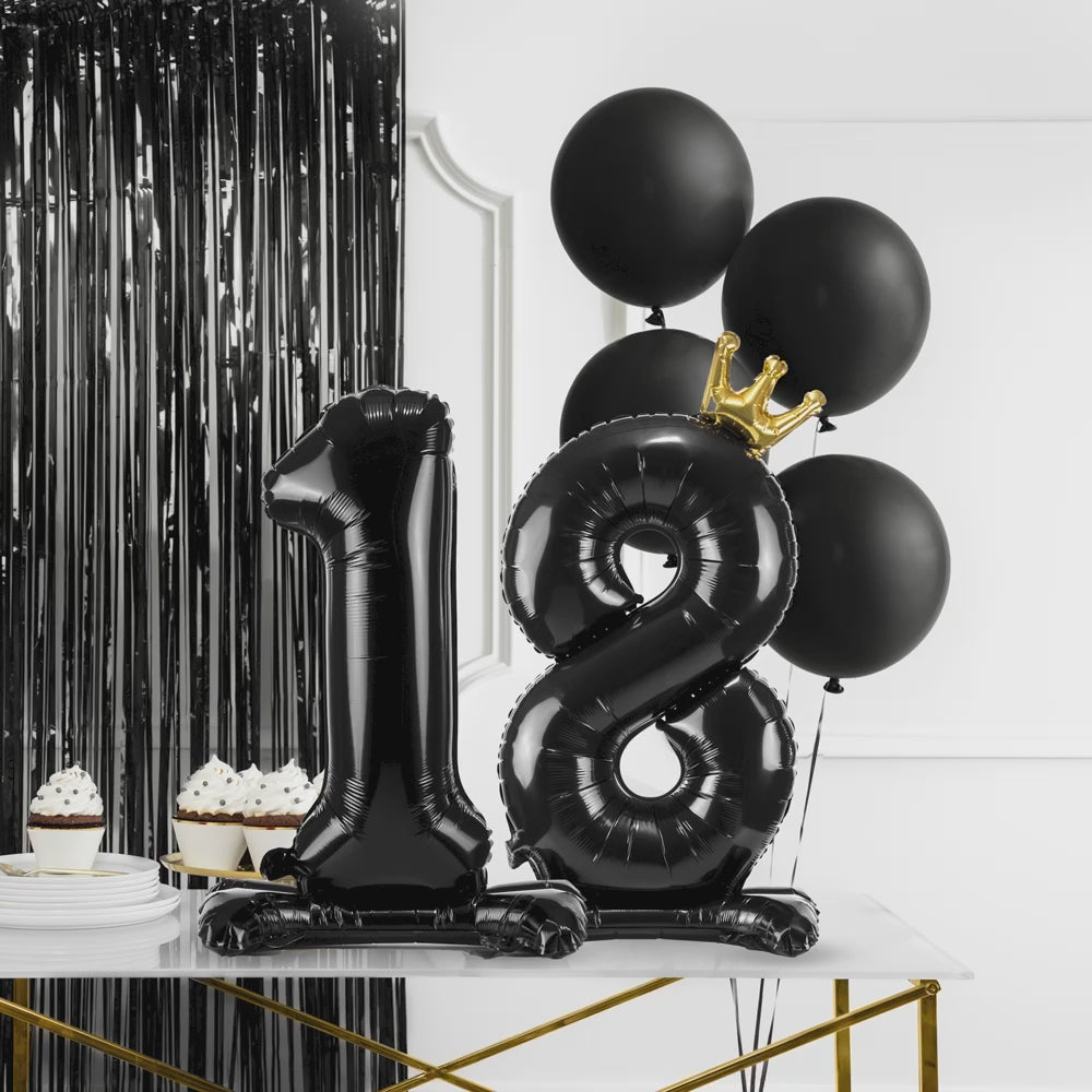 Globo de pie foil 18 cumpleaños en color negro con diseño de corona en dorado.