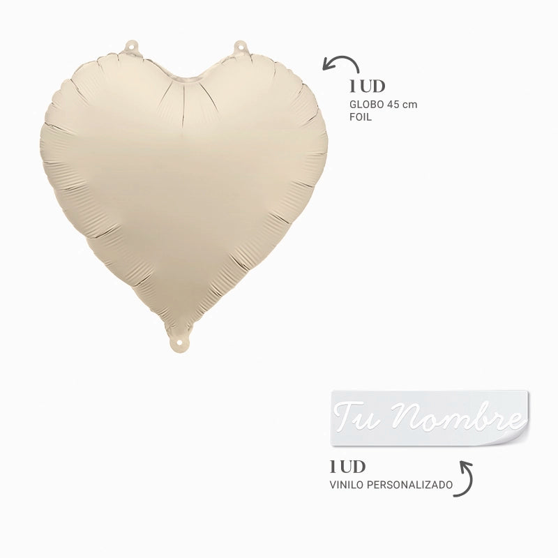 • 1 globo foil en forma de corazón mate color crema (apto helio) con vinilo de color blanco cortado y preparado para su montaje.