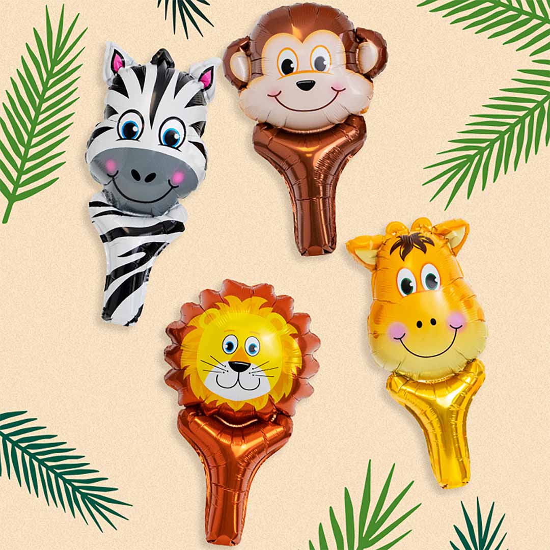 Set de 4 globos foil de mano con forma de mono, león, jirafa y cebra.