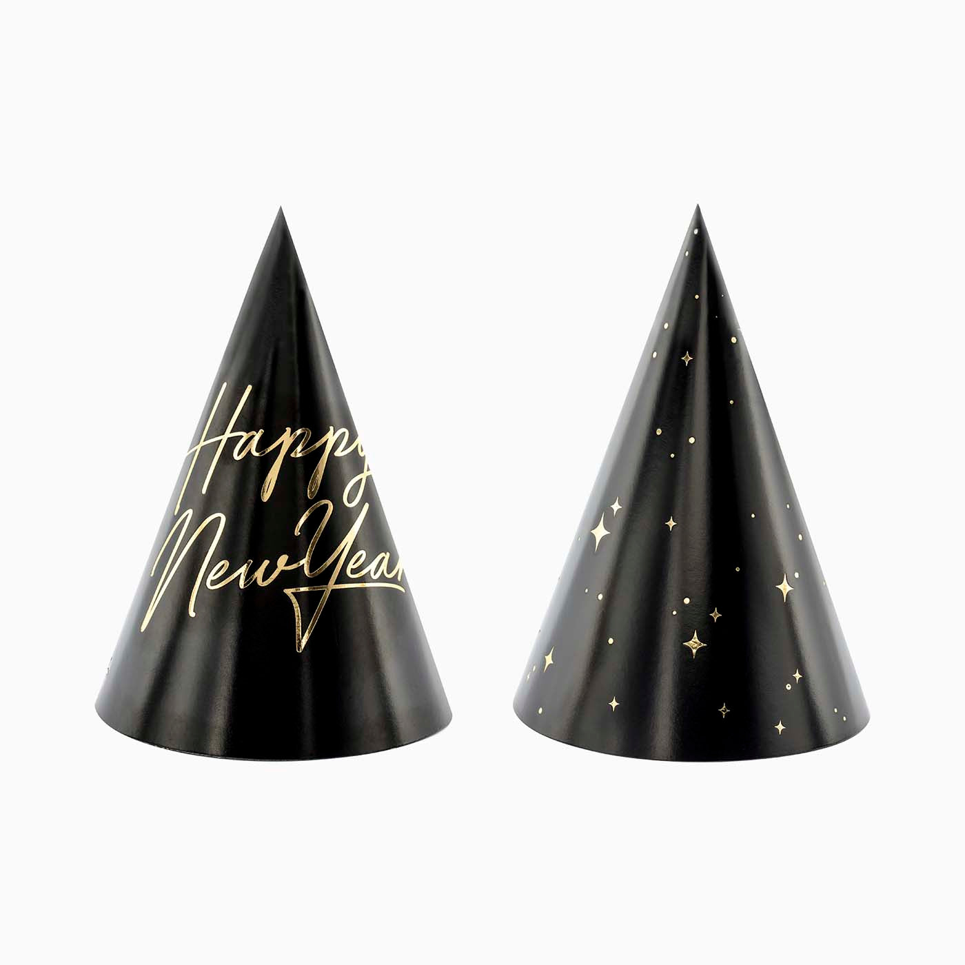 Gorros de fiesta "Happy New Year" fabricados en papel de color negro con estampado dorado metalizado.