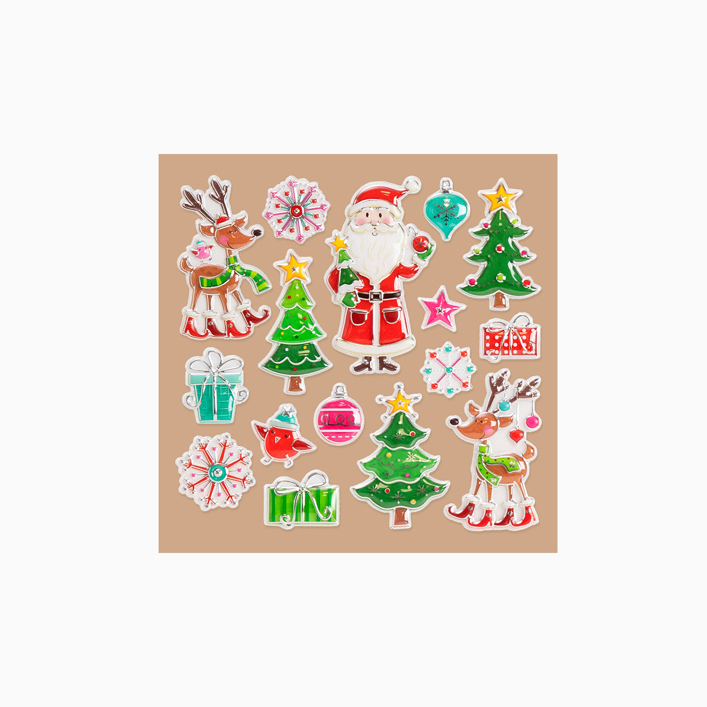 Estas pegatinas en concreto tienen diversos diseños que incluyen tres arboles de navidad con distinta decoración, un Papá Noel, dos simpáticos renos y múltiples accesorios navideños.