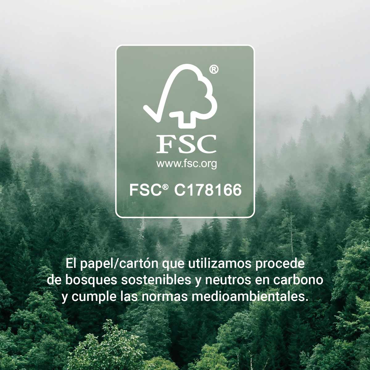 El papel/cartón que utilizamos procede de bosques sostenibles y neutros en carbono y cumple las normas medioambientales.