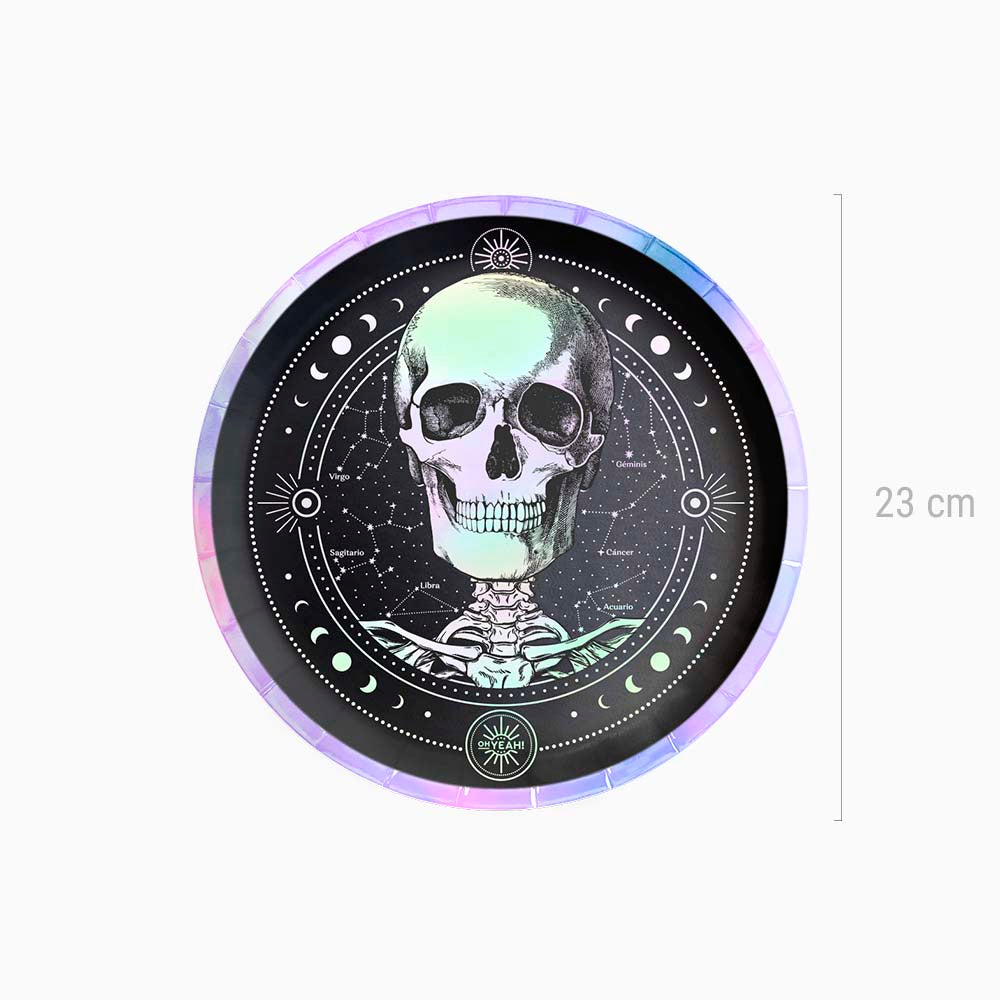 Pack de 6 platos llanos de Ø 23 cm con estampado de calavera y borde iridiscente.