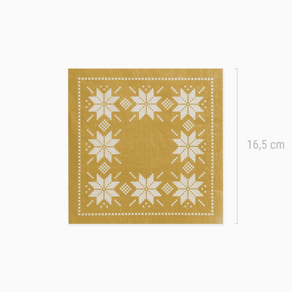 Pack de 30 servilletas metalizadas de papel color oro 33x33 cm doble capa y bordado en color blanco.