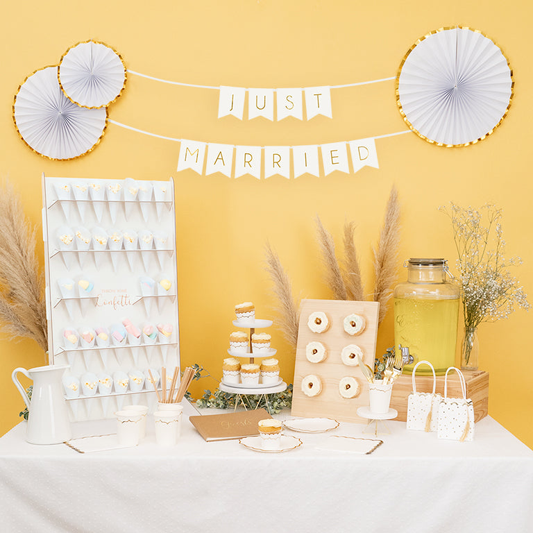 Set 3 abanicos decorativos con ribete oro metalizado de 23-32-40 cm. Ideales para tus fiestas de baby shower, cumpleaños, bautizos, bodas, comuniones y otras celebraciones. Los abanicos tienen una pegatina y cinta de sujección, el producto viene plegado listo para abrir y montar. Producto 100% reciclable y reutilizable.