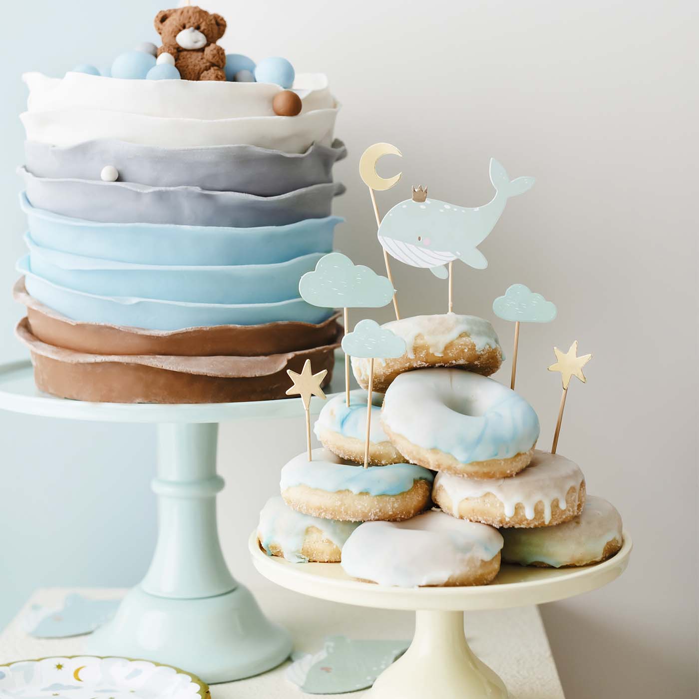 Dale un toque especial a tu pastel, cupcakes, decoración de primera Comunión o Baby Shower con estos toppers de ballena, nubes, estrellas y luna.